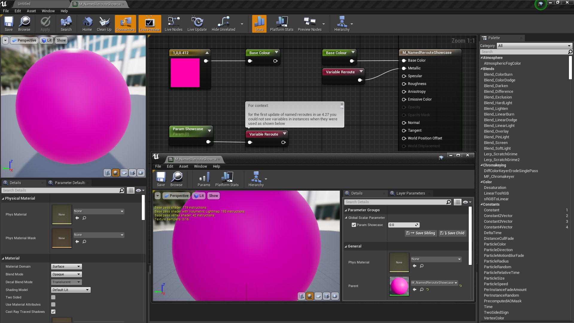 Named reroute nodes provide a much cleaner and simpler way to organise material graphs which can get absurdly messy, this is among one of the best features added to UE so this was among the first things I saught to backport fully.