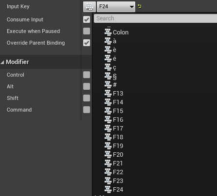 Due to modern keyboards no longer having keys such as F13-F29 naturally Unreal Engine does not support these input methods as they are an uncommon key to have these days, I have them though…